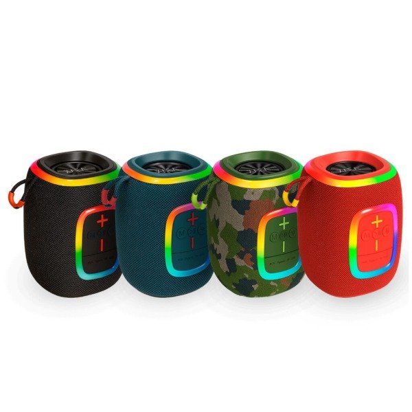 Con 8W de potencia real, este parlante portátil combina tamaño reducido con un sonido potente. Tiene autonomía de hasta 5 horas, luces LED, múltiples funciones (FM, TF, TWS, USB) y carga rápida por puerto Tipo C.